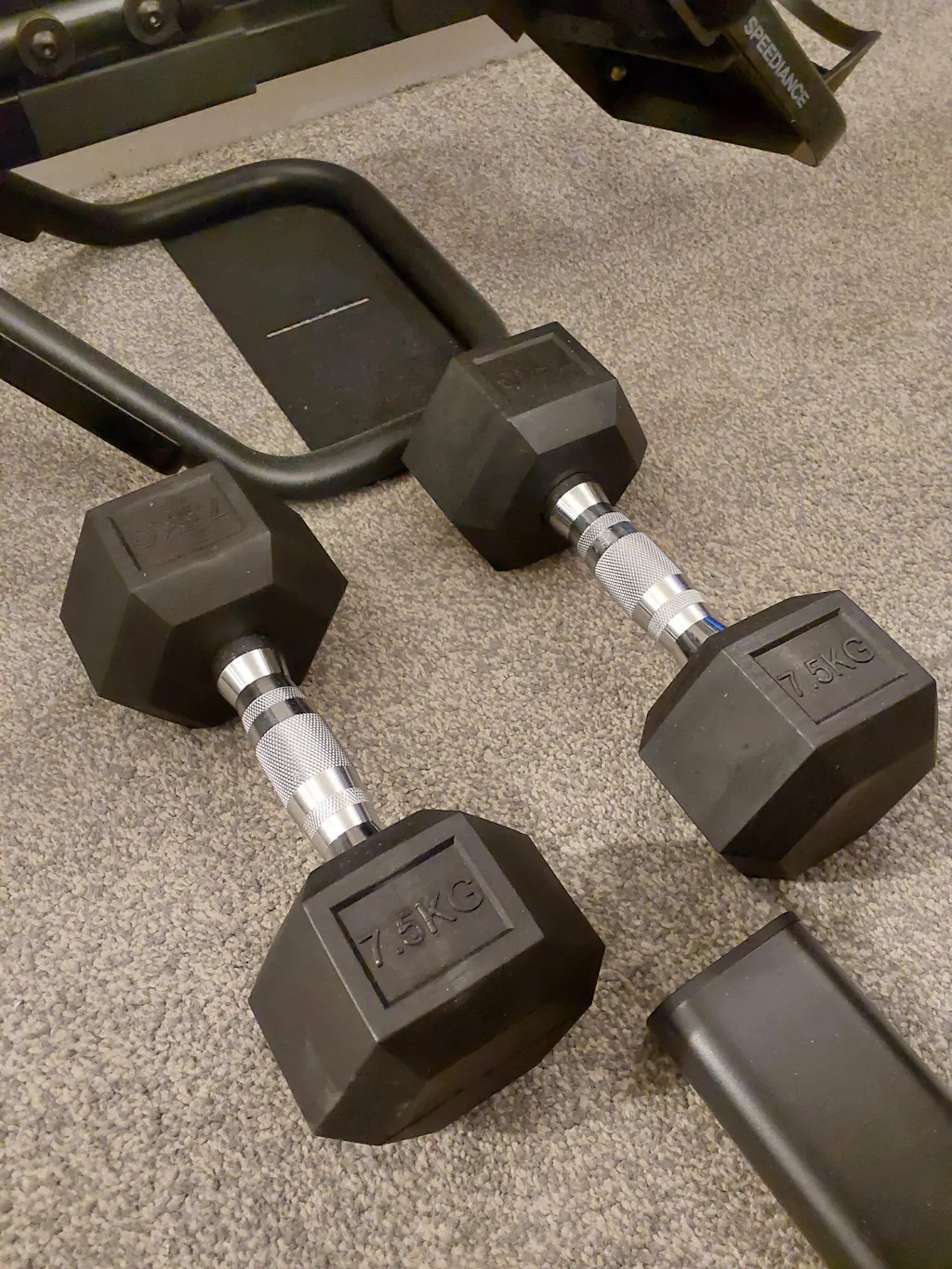 The hexagonal shape of the dumbbell heads prevents rolling, while the chrome-contoured handles provide a comfortable fit.